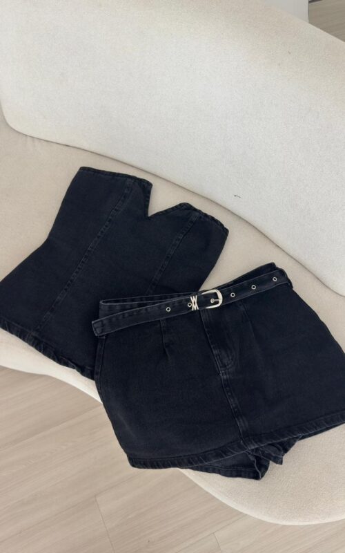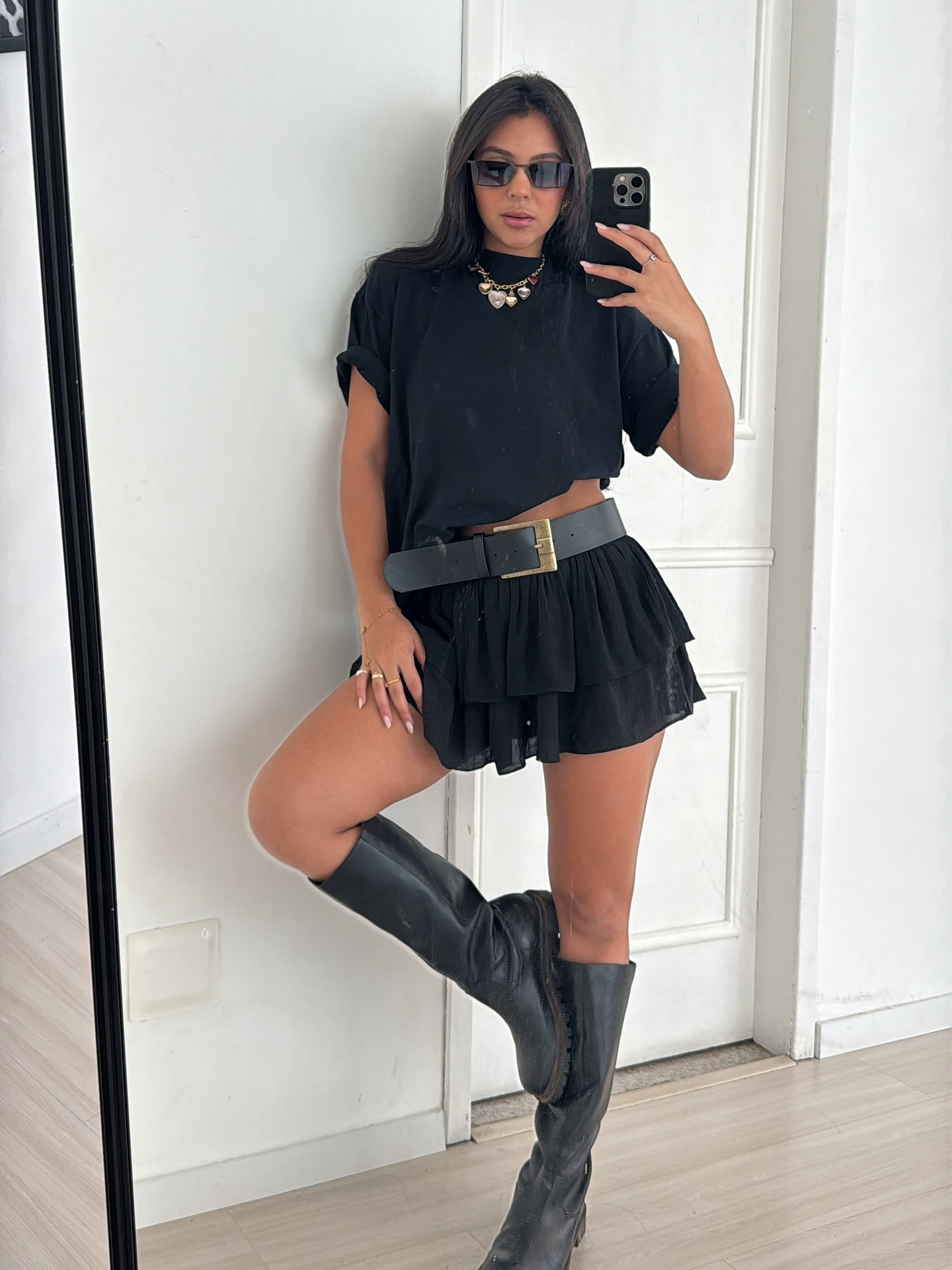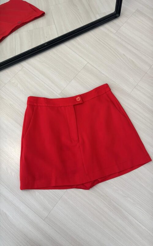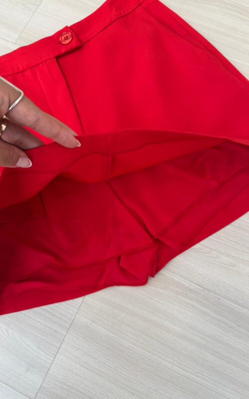 Alfaiataria premium. Cintura alta que alonga. Modelagem estruturada. Acabamento impecável. Fecho lateral discreto. Short por baixo. Saia atrás.