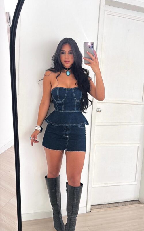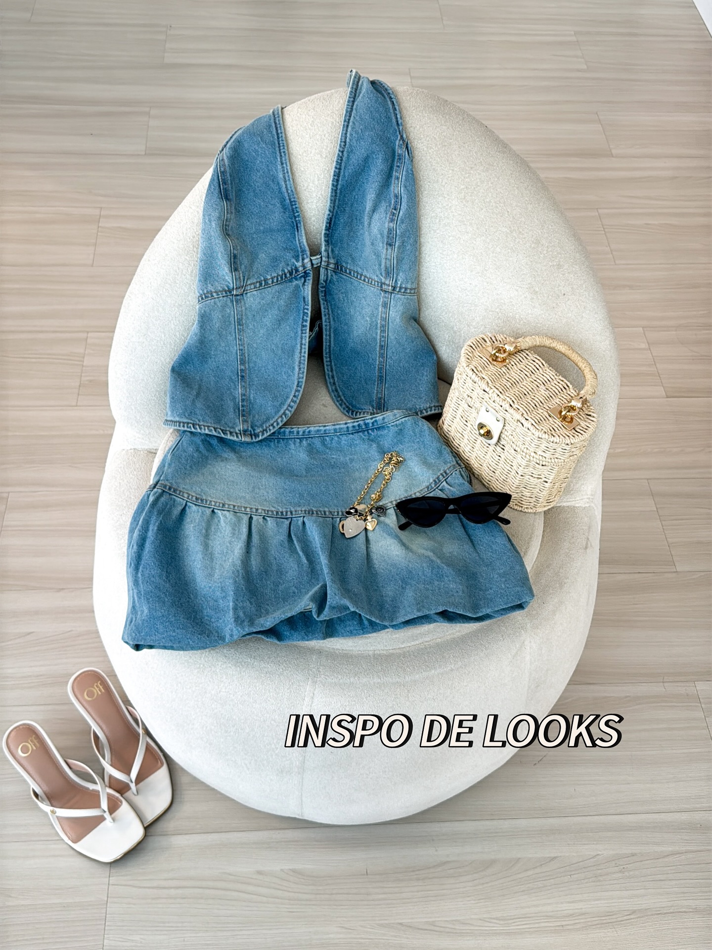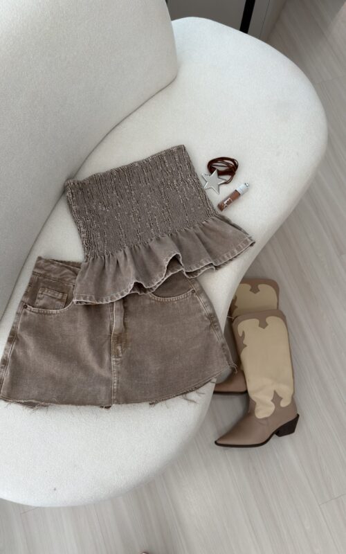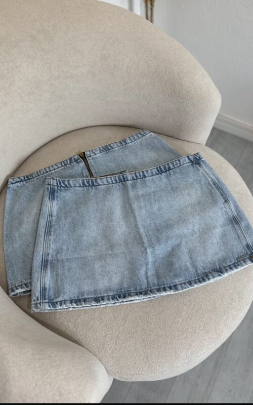 Saia curta em jeans, com caimento estruturado e acabamento moderno.