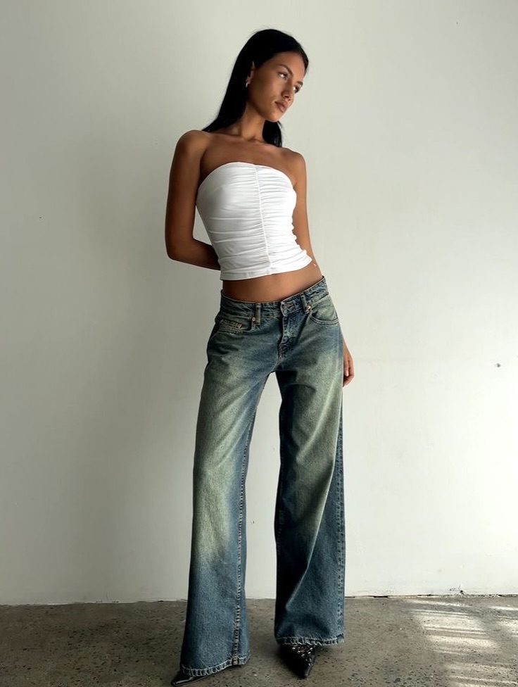 Blusa tomara que caia com modelagem peplum, zíper posterior e elástico nas costas, garantindo melhor ajuste, conforto e sustentação.