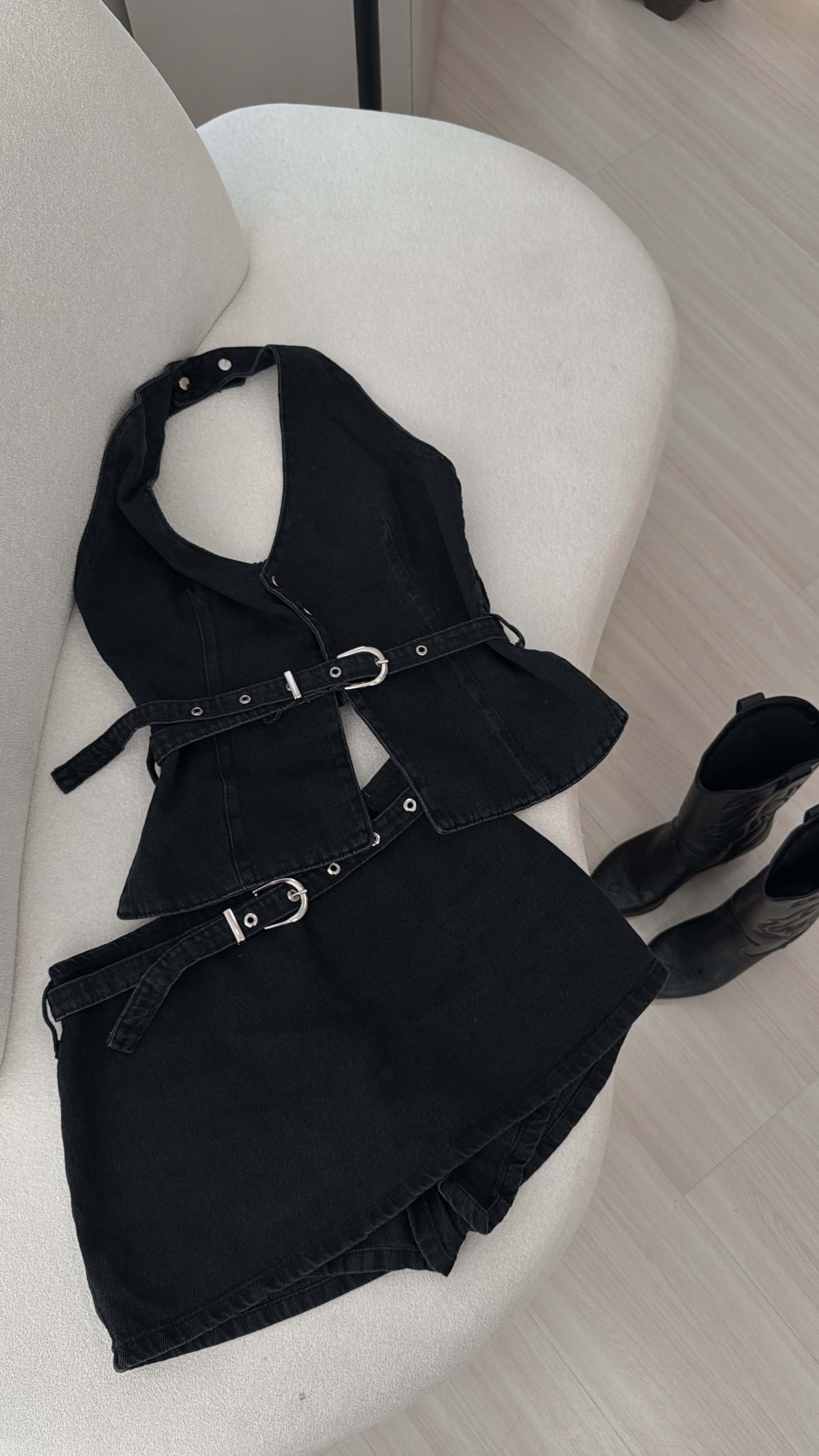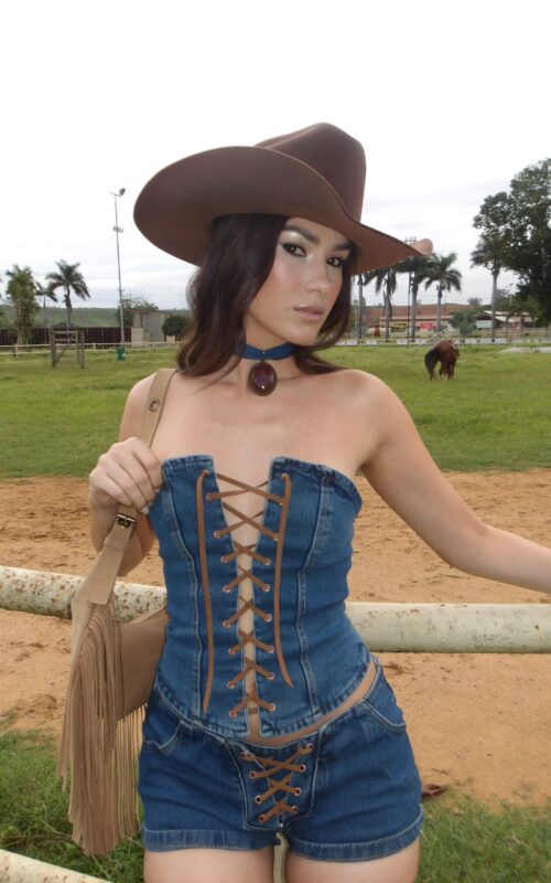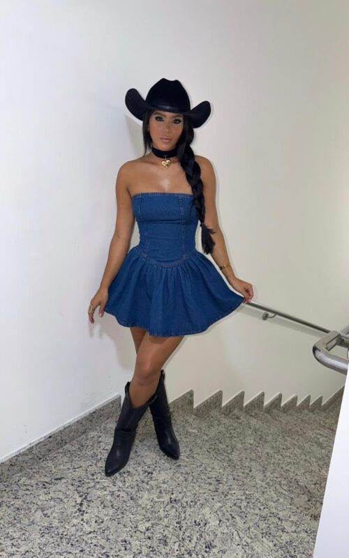 Conjunto jeans com top tomara que caia de amarração frontal e short de cintura baixa. Modelagem que valoriza o corpo, com acabamento moderno e visual marcante — ideal para festas e shows.