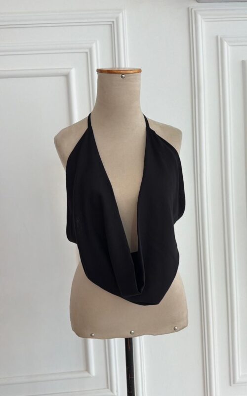 Blusa frente única com caimento na frente TUDO. Amarra nas costas e pescoço.