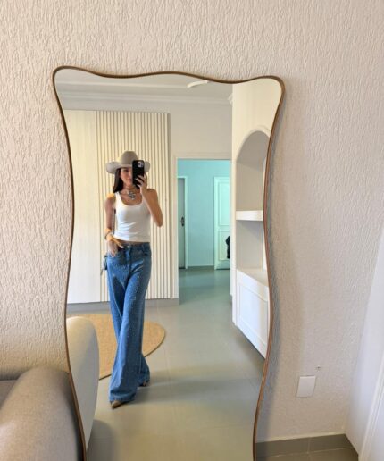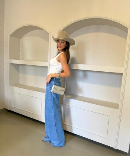 CALÇA JEANS COM APLICAÇÃO DE STRASS. PARA FICAR IGUAL A DA FOTO, PEGAR UM TAMANHO MAIOR.