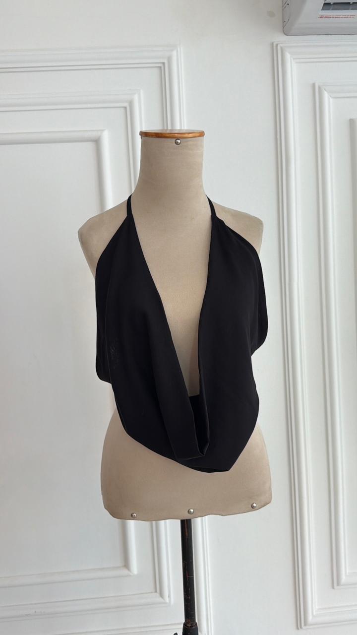 Blusa frente única com caimento na frente TUDO. Amarra nas costas e pescoço.