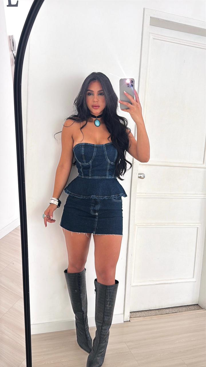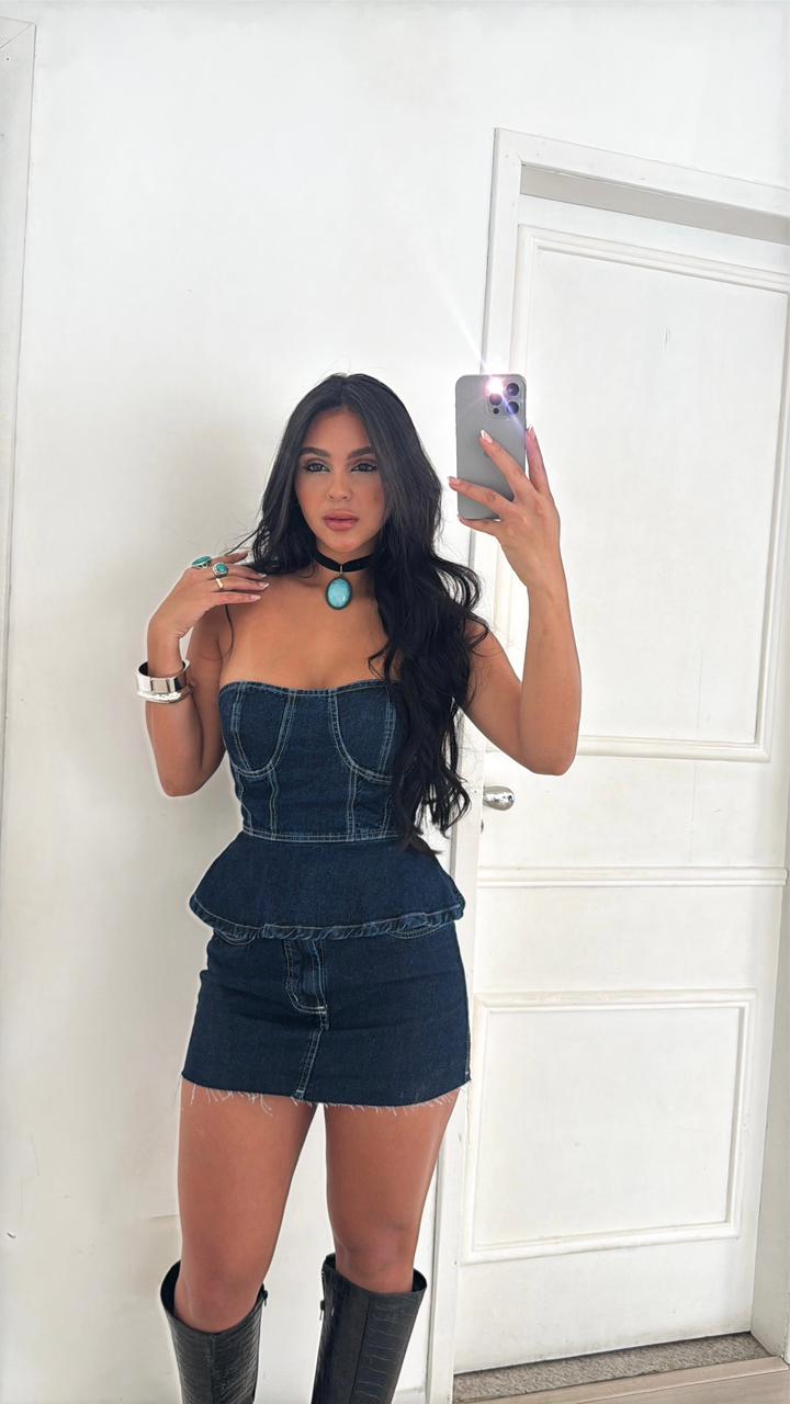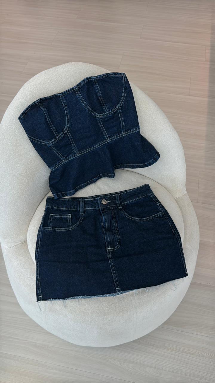 Conjunto confeccionado em jeans.
