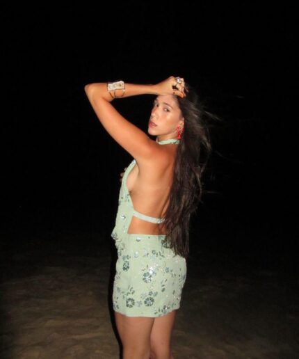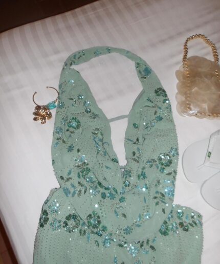 Conjunto com miçangas bordadas, que traz brilho sofisticado e efeito delicado. A peça é forrada, garantindo conforto e segurança ao