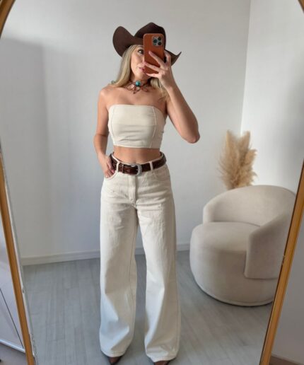 Blusa tomara que caia com modelagem peplum, zíper posterior e elástico nas costas, garantindo melhor ajuste, conforto e sustentação.