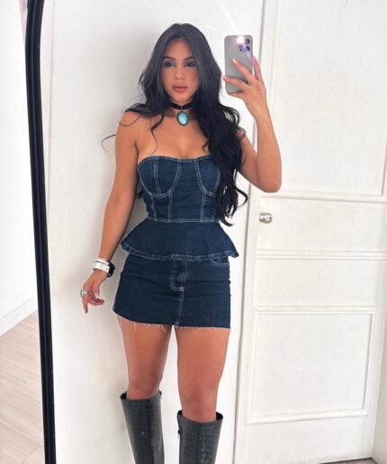 Saia curta em jeans, com caimento estruturado e acabamento moderno.