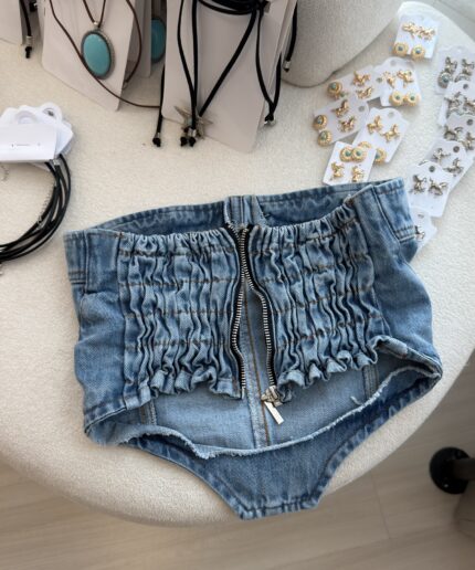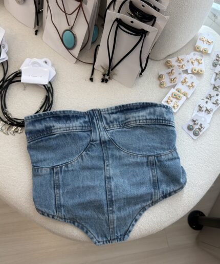 Cropped jeans estilo corset com recortes estruturados que valorizam o busto e barra assimétrica que traz um toque moderno ao