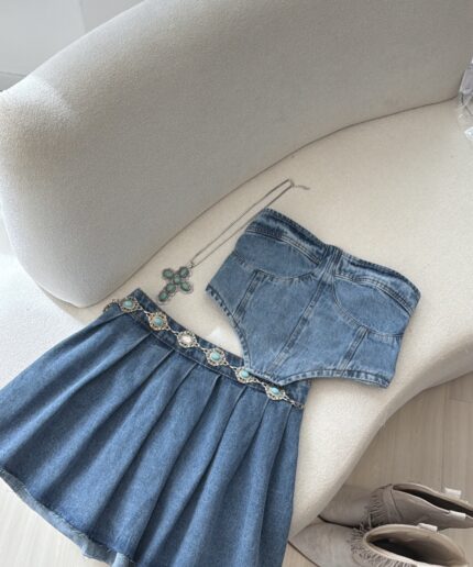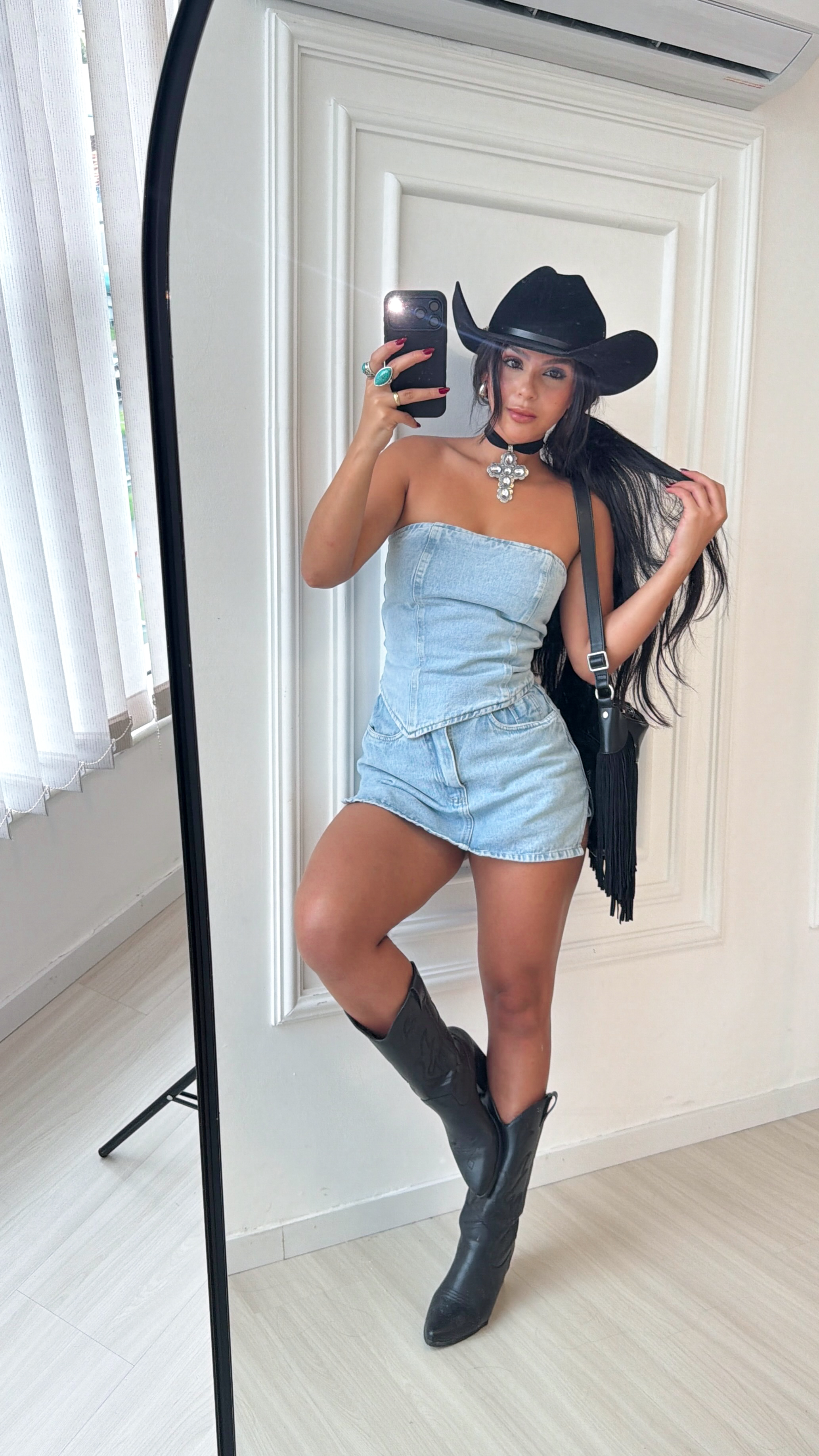 Conjunto jeans com top tomara que caia de amarração frontal e short de cintura baixa. Modelagem que valoriza o corpo, com acabamento moderno e visual marcante — ideal para festas e shows.