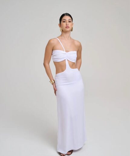 Vestido com modelagem de um ombro só, estruturado com ombreira, que valoriza a silhueta.